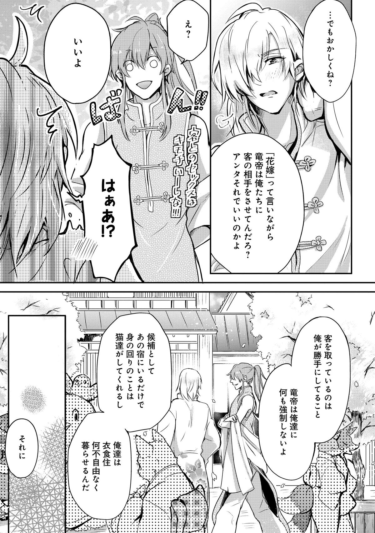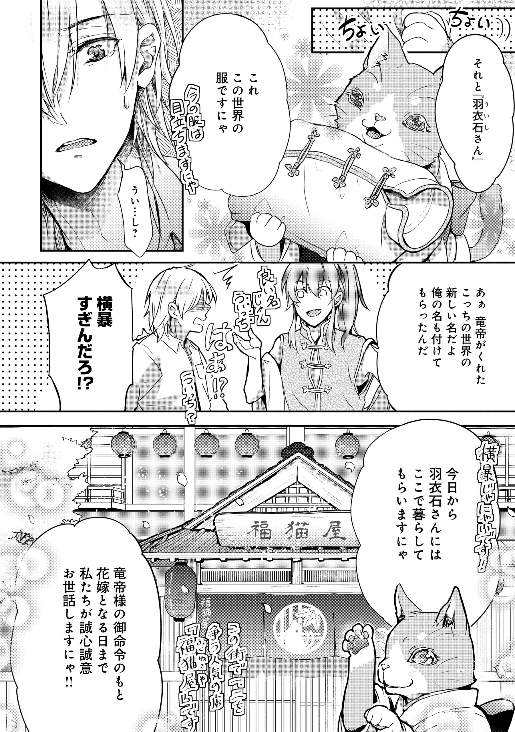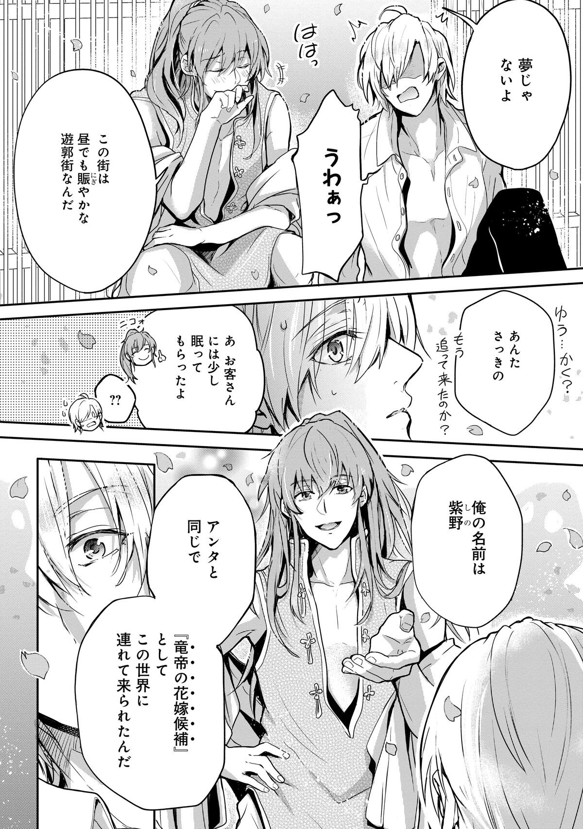 あの声の主は「竜帝」で、その花嫁候補として見初められたという羽衣石は、同じく花嫁候補の人間・紫野に案内されるままに遊郭でお世話になることに。